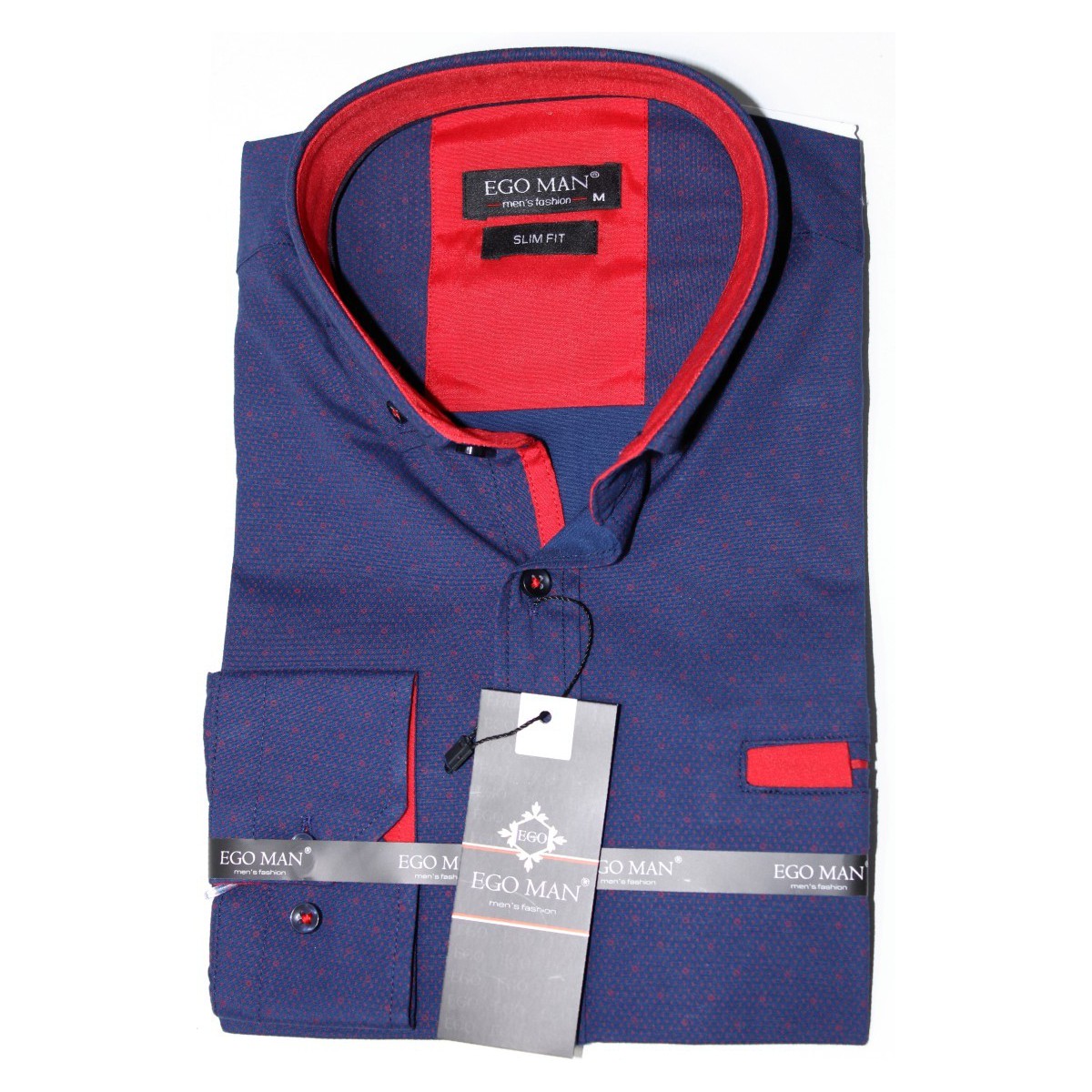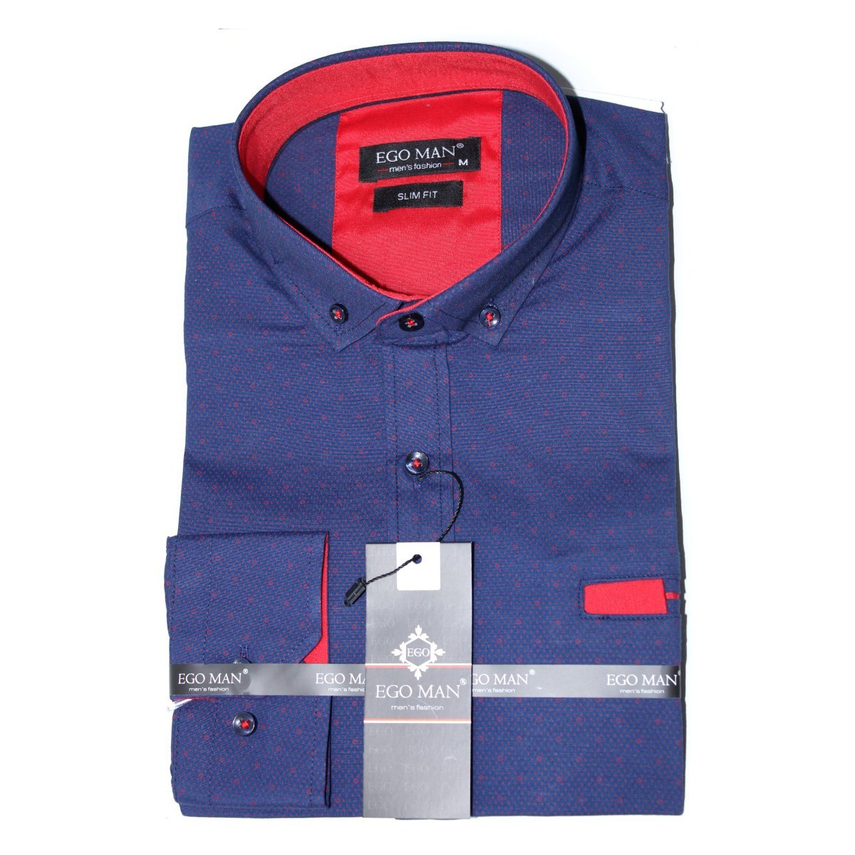 Modrá pánska košeľa s červeným drobným vzorom a červenou podšívkou slim fit EgoMan