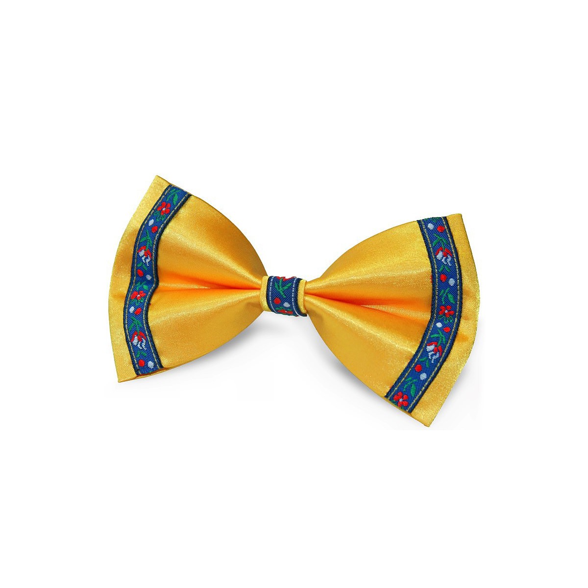 Folklórny motýlik žltý s modrou úzkou krojovkou na okrajoch biela-červená-zelená dizajn BWT