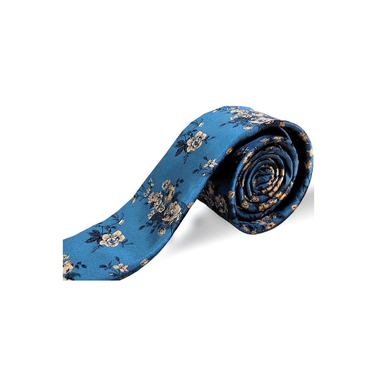 Modrá kravata so zlatobéžovým kvetovým vzorom slim