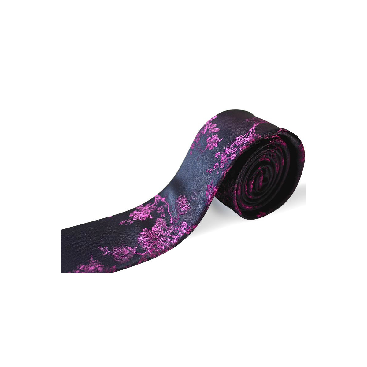 Tmavomodrá kravata s cyklámenovým kvetovým vzorom slim