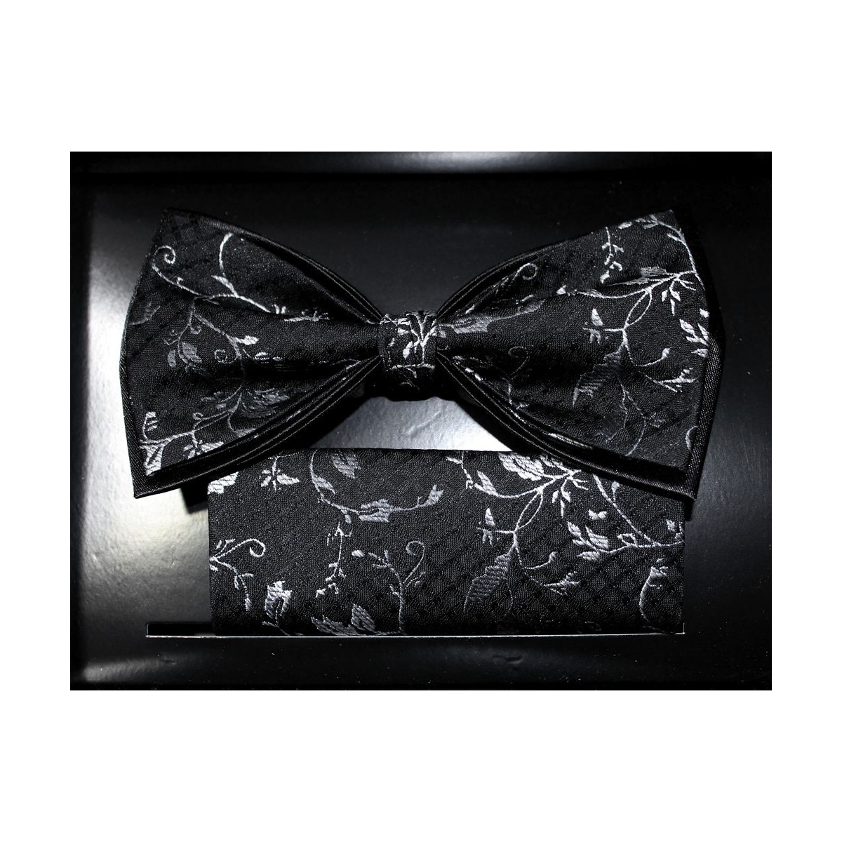 Čierny motýlik s bielym rastlinným motívom s vreckovkou