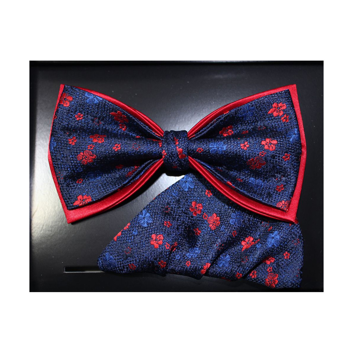 Tmavomodrý motýlik s červeným kvetovým vzorom s vreckovkou