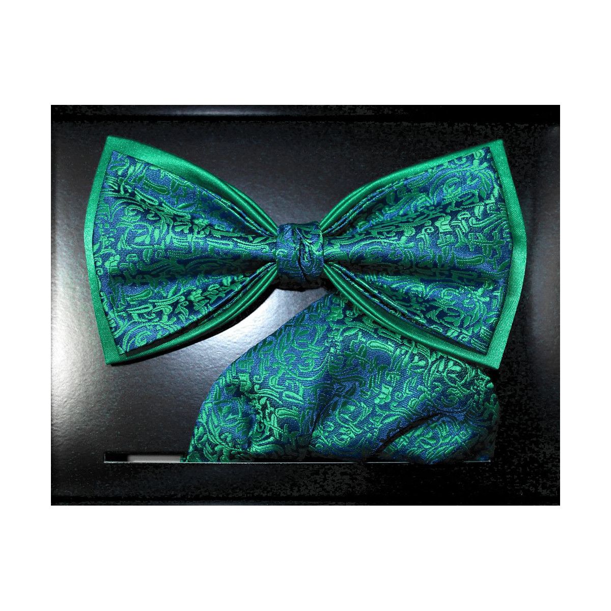 Zelený motýlik rastlinný motív na modrom podklade s vreckovkou