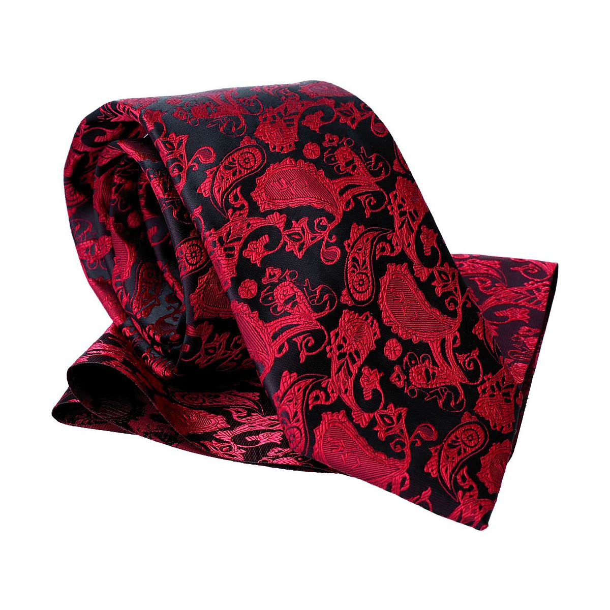 Kravata s vreckovkou červená paisley na čiernom podklade