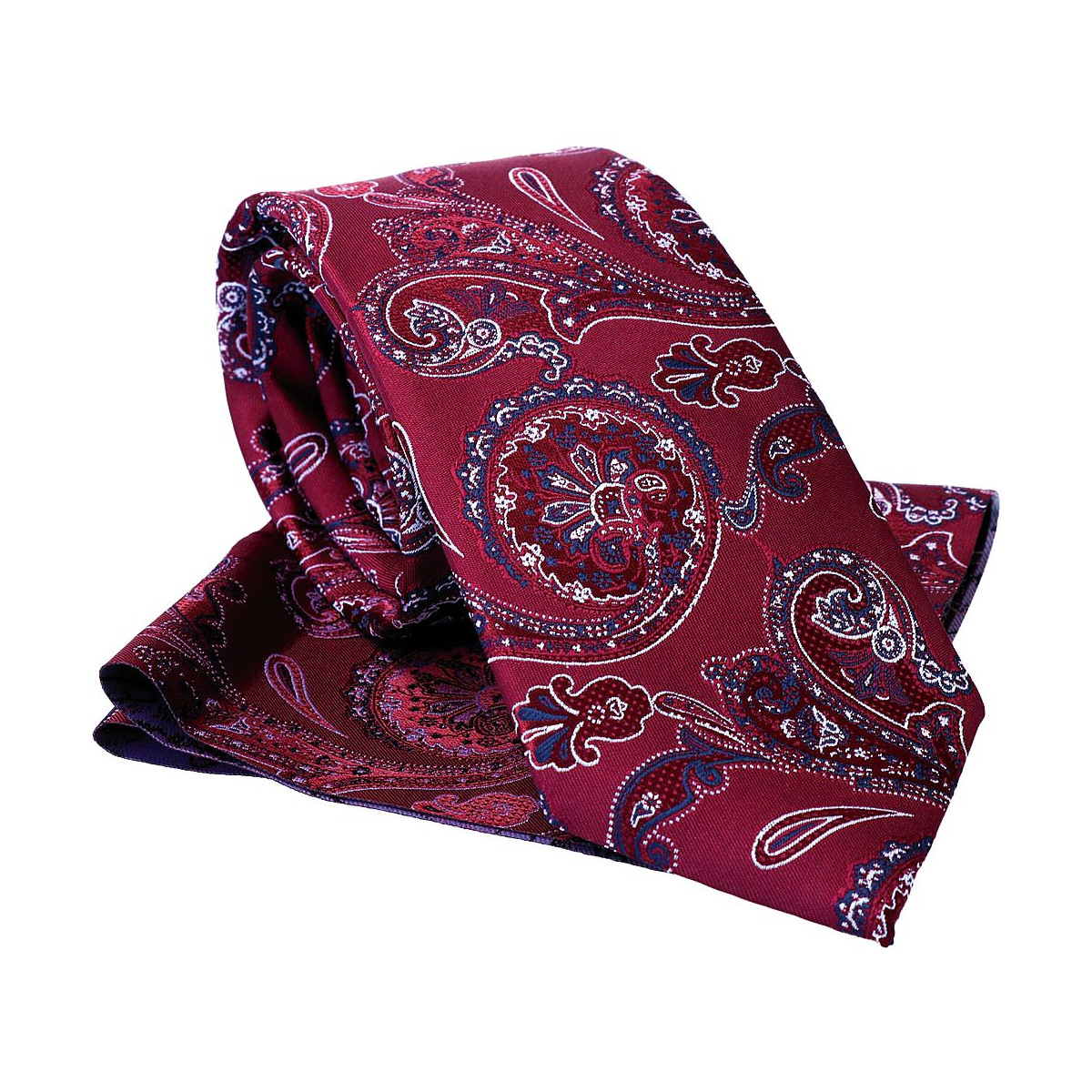 Kravata s vreckovkou bordová s modro-bielym vzorom paisley