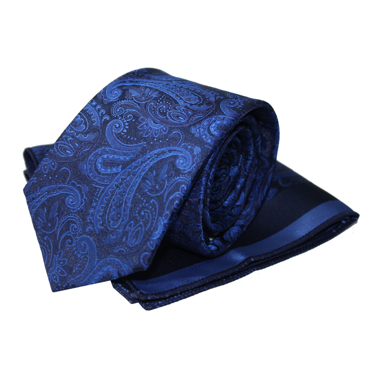 Kravata s vreckovkou parížska modrá na tmavomodrom podklade