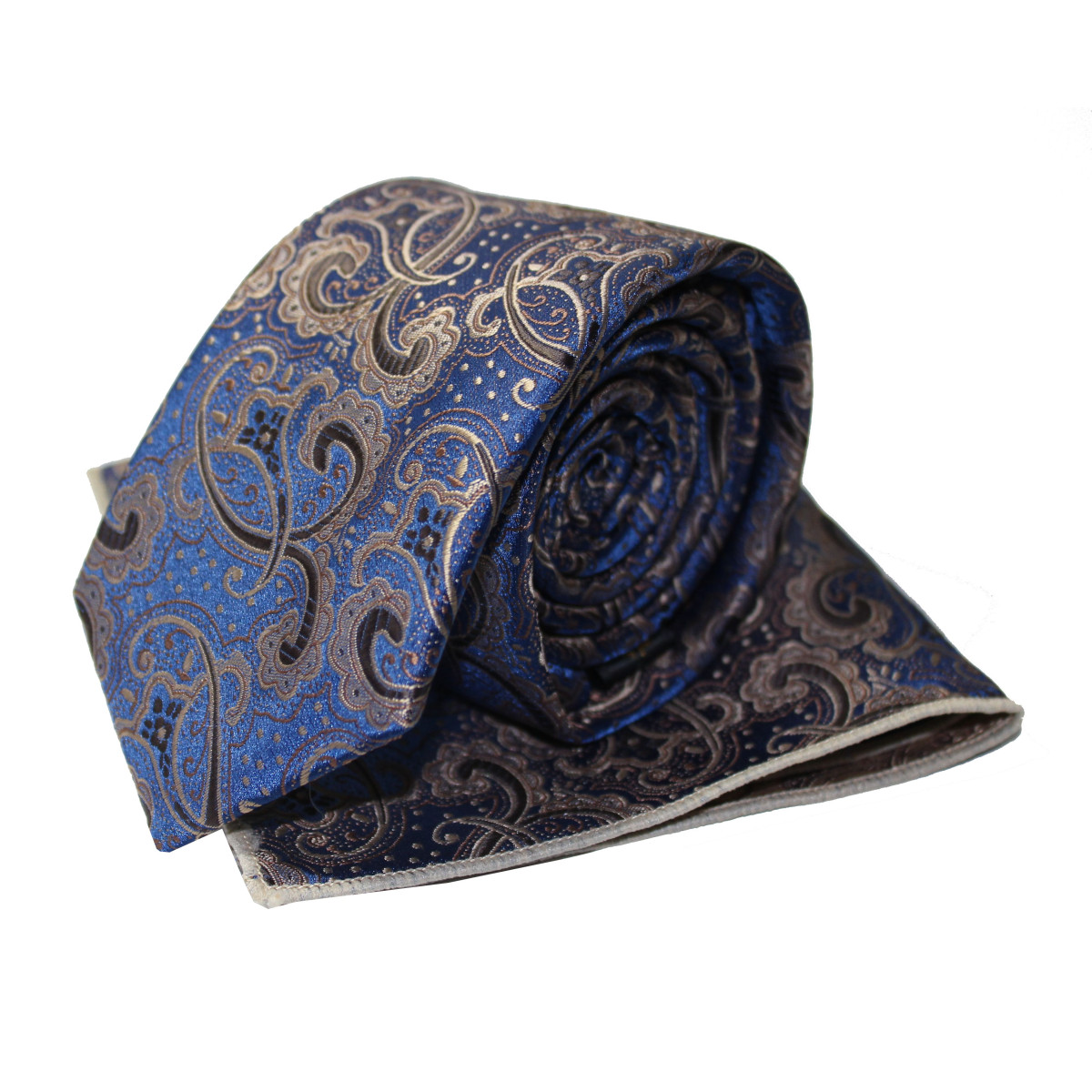 Kravata s vreckovkou zlatobéžová na podklade parížska modrá