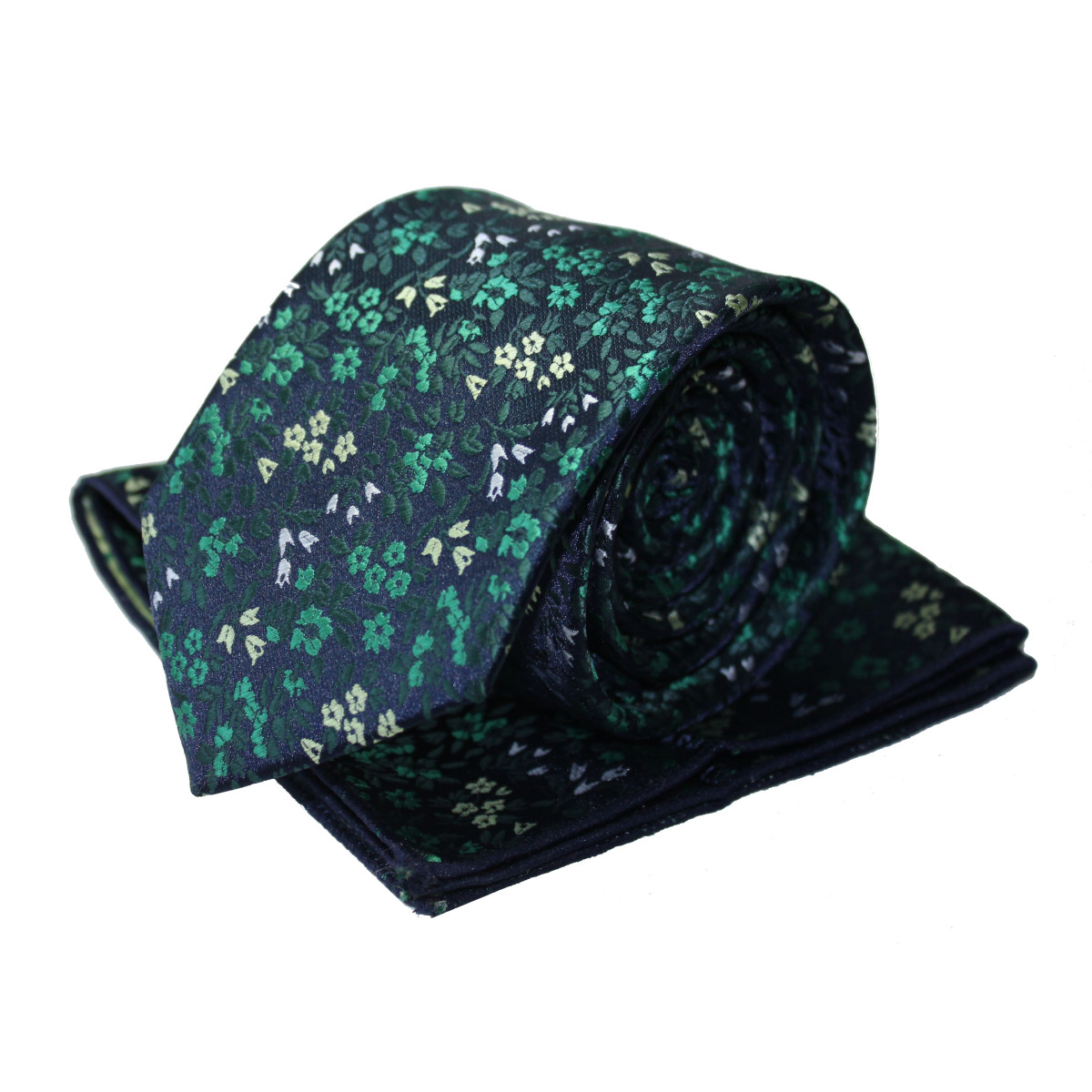 Tmavozelená kravata s vreckovkou kvetovaná na tmavomodrom podklade