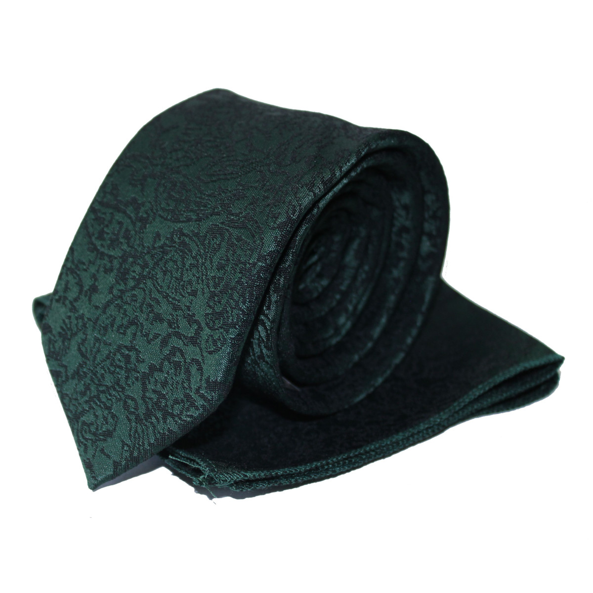 Kravata s vreckovkou tmavozelená machová kvetový vzor