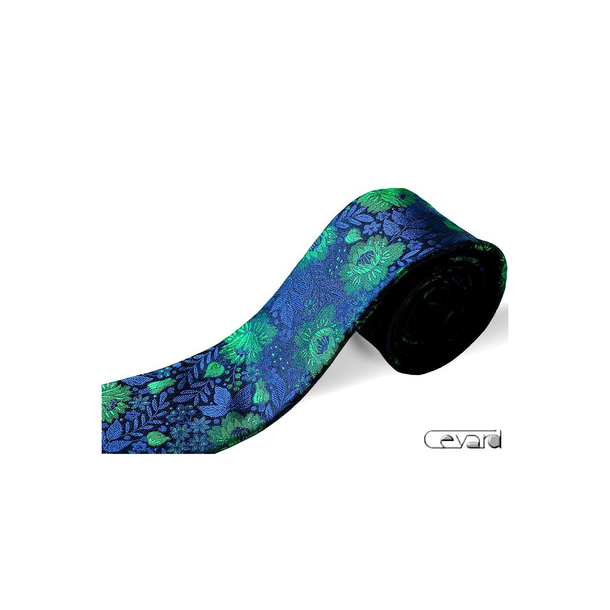 Zelená kravata slim s kvetovým vzorom na tmavomodrom podklade
